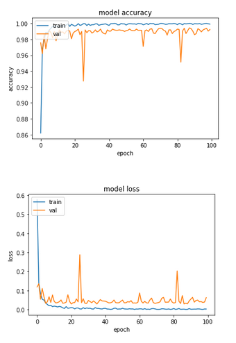 OK, so on running the above code, the model iterates through the data, steadily providing us with the training loss, training accuracy, validation loss and validation accuracy for each of the 100 epochs we asked the model to run for. Towards the end of the run, the output looks something like this (the exact numbers will be different for each run):
