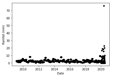 ax1 = rain_df.plot.scatter(x = 'Date', y = f'{rains[i]}', color=colours[i])